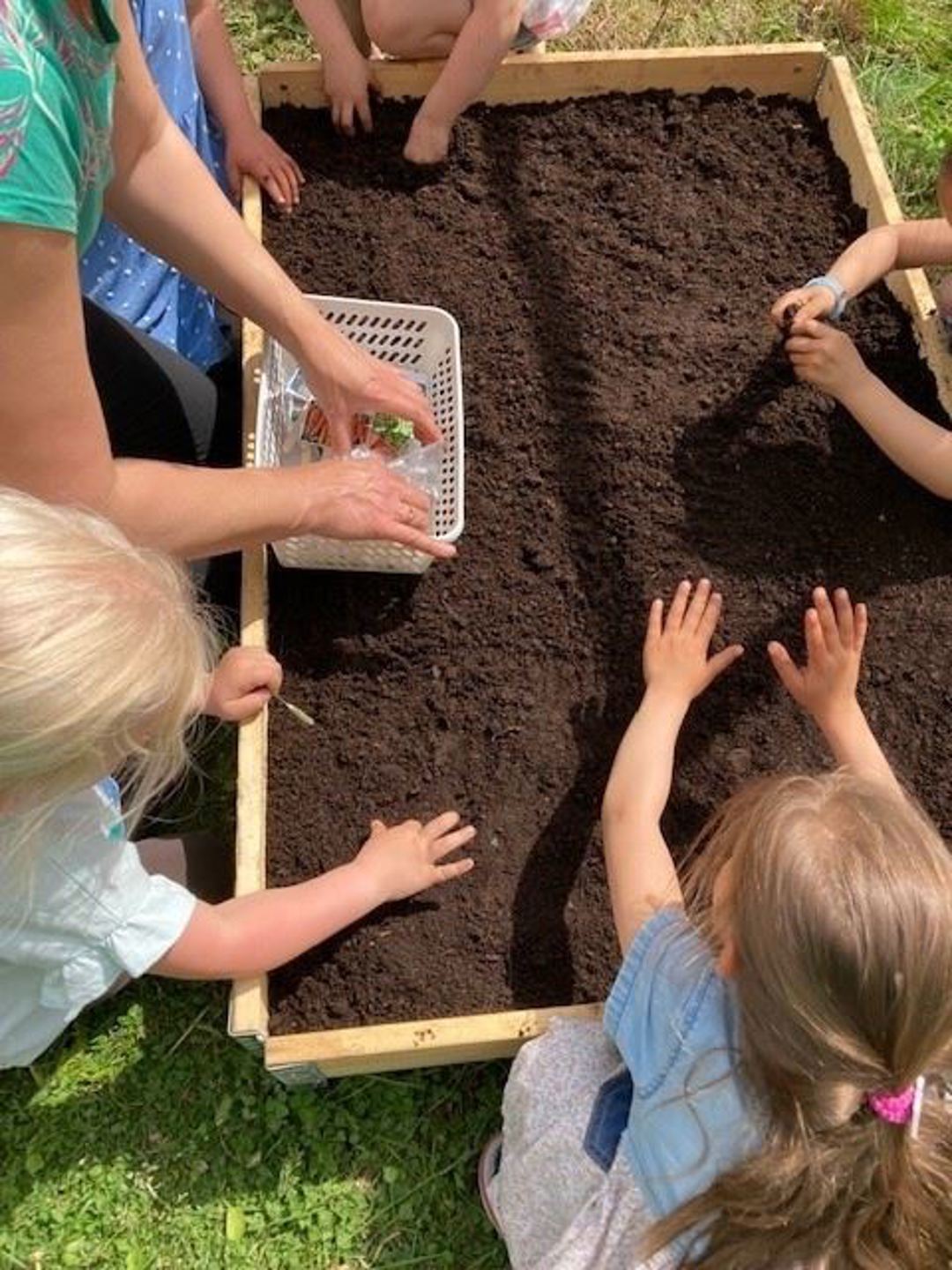 Det startet med en forespørsel fra Kongsberg hagelag, samt gaver fra skolestartere. Nå har vi fått til en liten grønnsakshage med tomater, grønnkål, poteter, salat, gulrot, bønner og sukkererter. Barna har vært med å lempa jord, gravd, sådd og planta. Nå spirer det godt og vi vanner og steller, vi gleder oss til å se veien videre.